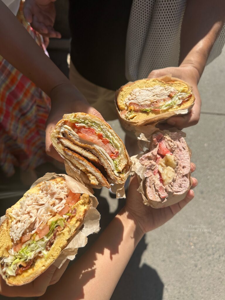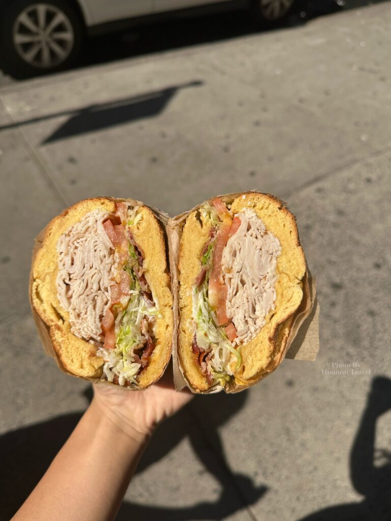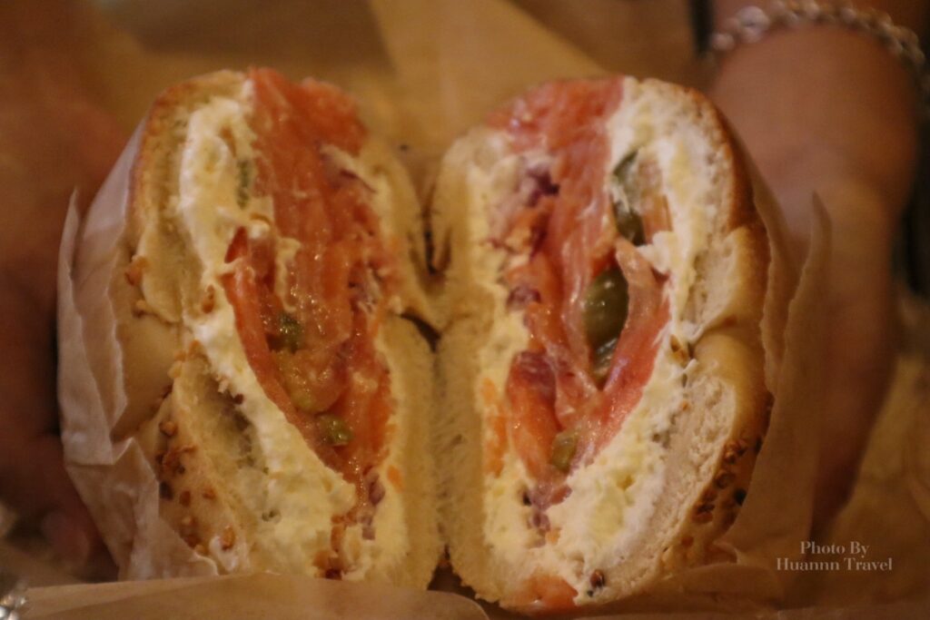 當時不知道鹹的貝果要選什麼口味,於是看到牌子上面掛「New Yorker」時,就心想都到紐約了,不如吃吃看吧!結果家人意外的非常喜歡,連吃了兩天。內餡是由兩面薄薄的炸雞排和雞肉片組成,有番茄、生菜,醬料則是蒜味美乃滋,整體層次非常豐富~貝果口味我們選擇了蛋口味(隔天換成可頌)的,很特別!