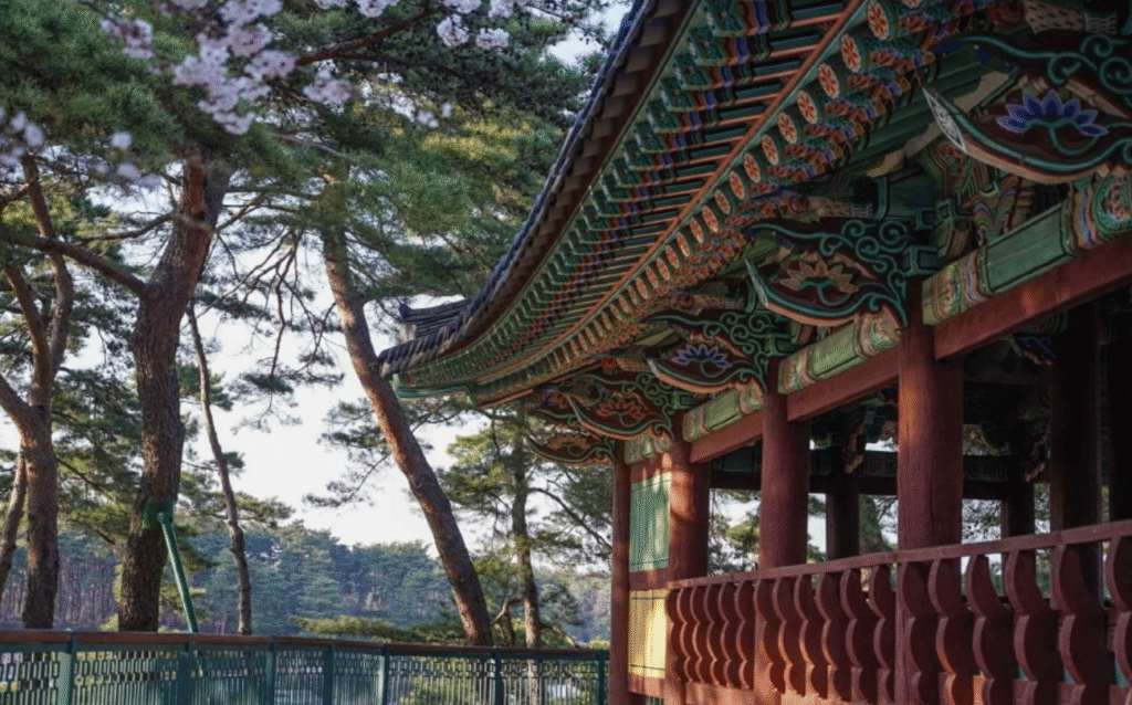 韓國傳統亭閣建築,面湖而建,風景秀麗,是賞櫻與湖景散步的理想地點!