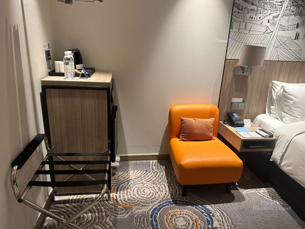 ▼床旁邊有一個小小椅子和冰箱!水每一天都會補,也有熱水壺晚上可以泡泡麵吃