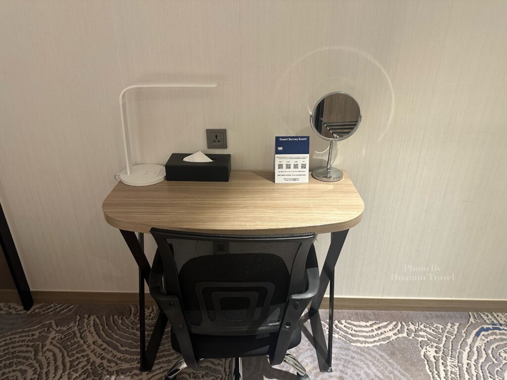 ▼有一個小小的桌子可以辦公,還有檯燈和插座