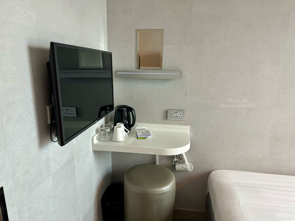 ▼有電視、茶杯、吹風機、一個小桌子,上面有鏡子可以化妝,然後又有插頭!而且還有type c和usb的插孔,非常便利,就不用豆腐頭了~