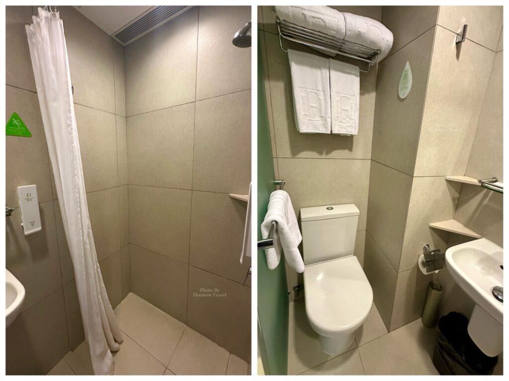 ▼洗手間的部分是乾濕分離,有提供浴巾、洗手台旁也有置物空間和掛鉤,可以掛盥洗包。硬要說一個小缺點可能就是花灑是固定在牆上的,但我覺得影響不大,而且熱水很快就出來~